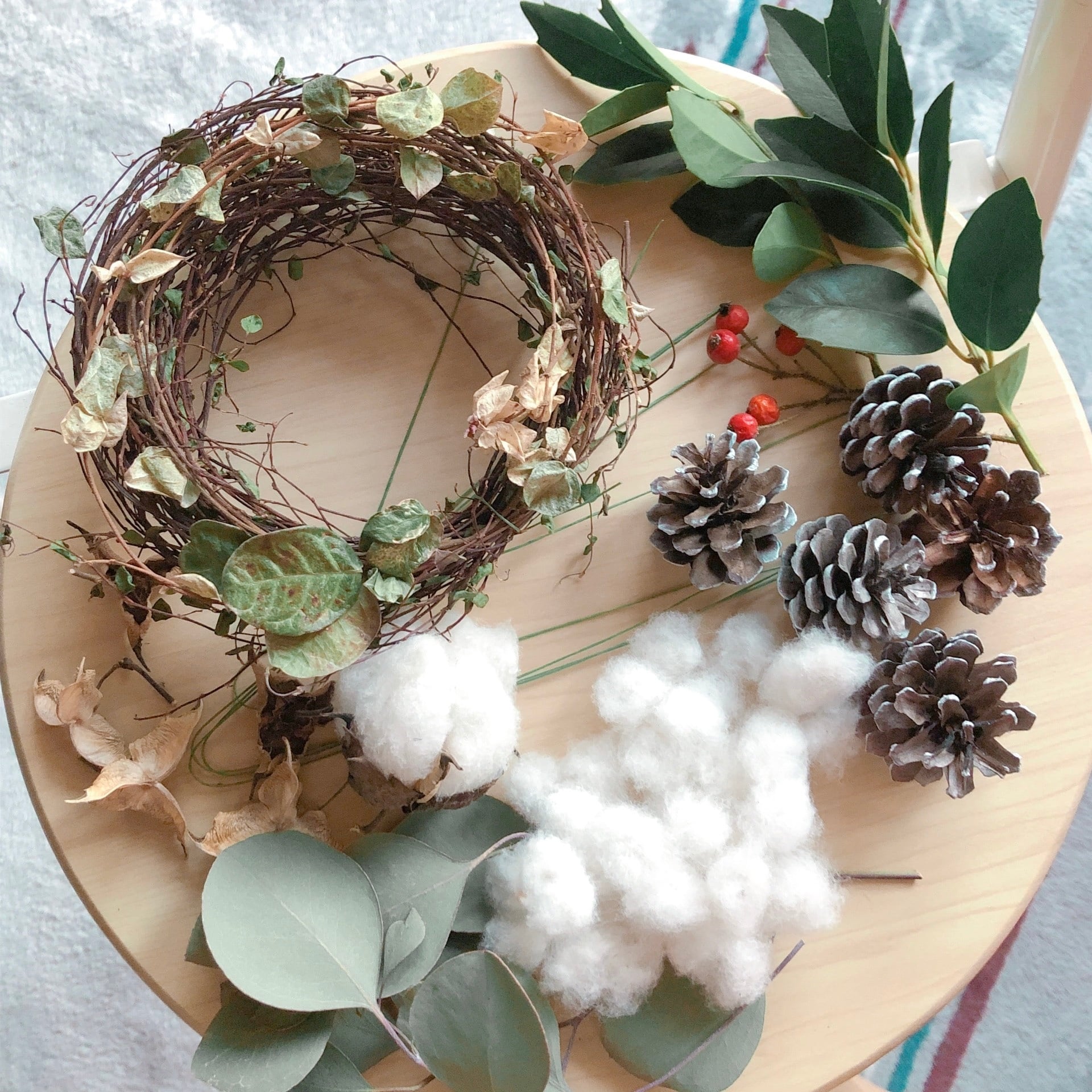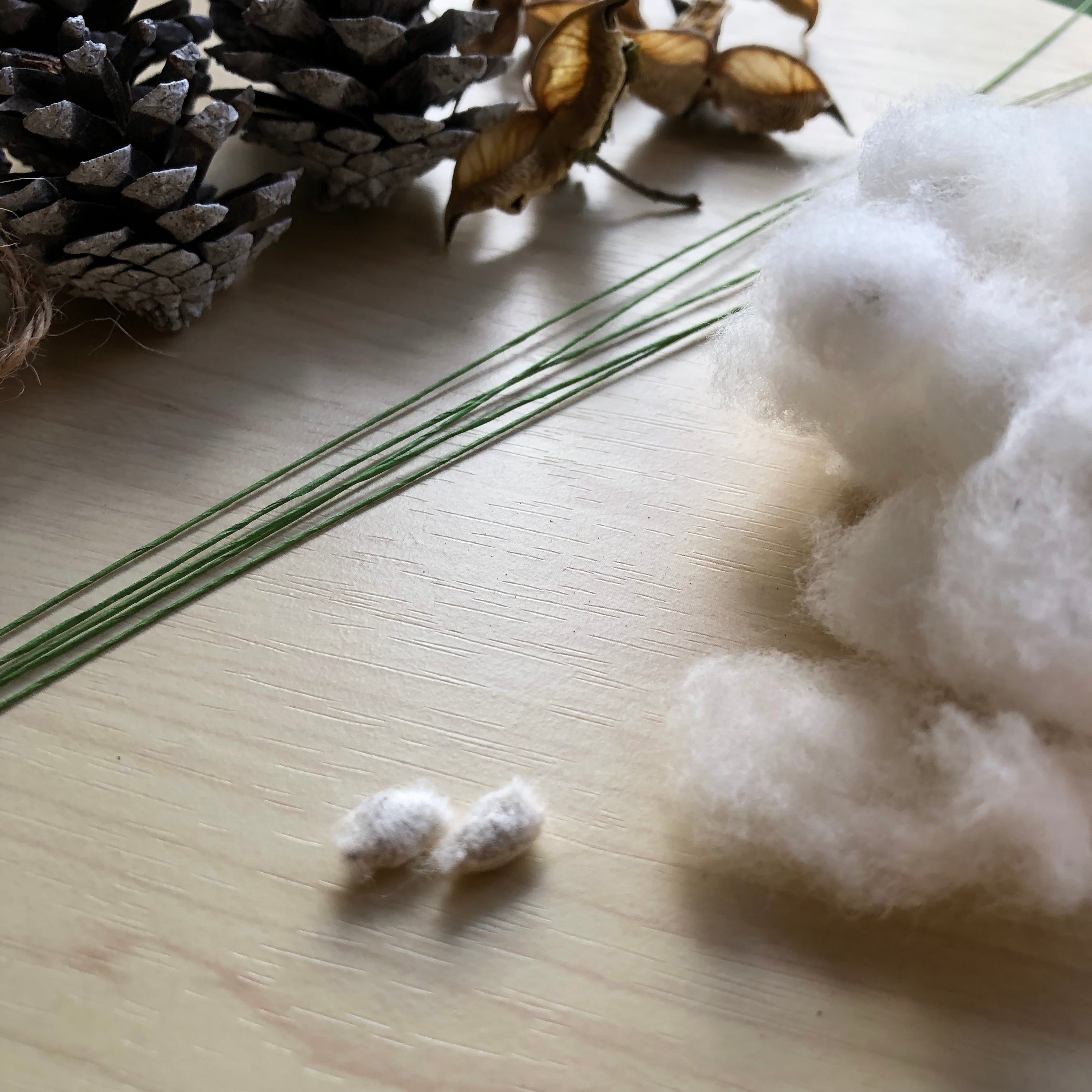 すべて無農薬の天然素材です。松ぼっくりは洗浄後にホワイト染めしました。ナチュラルな素材感を残しつつ染めてあります。綿の殻は表でも裏でも好きな方で使えます。