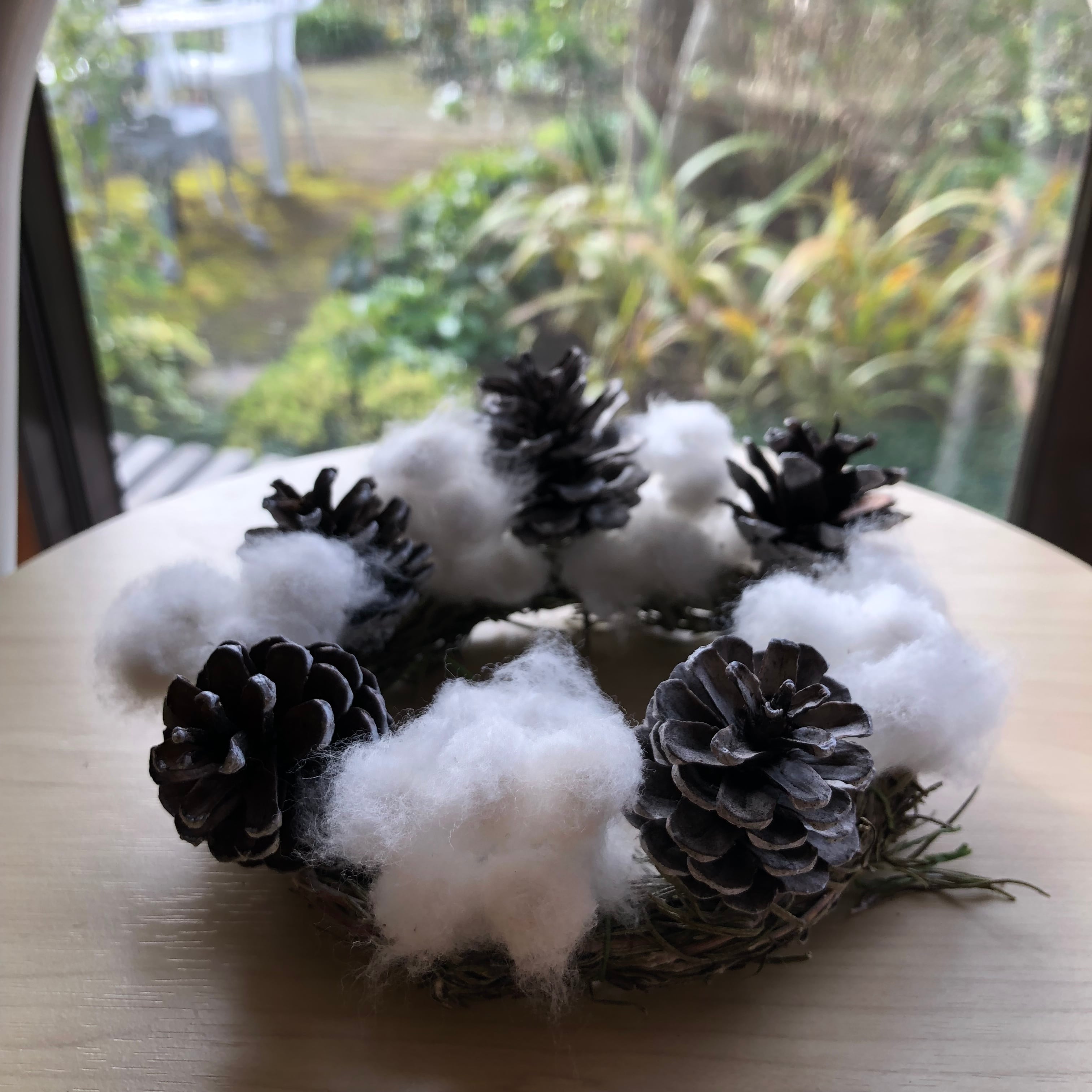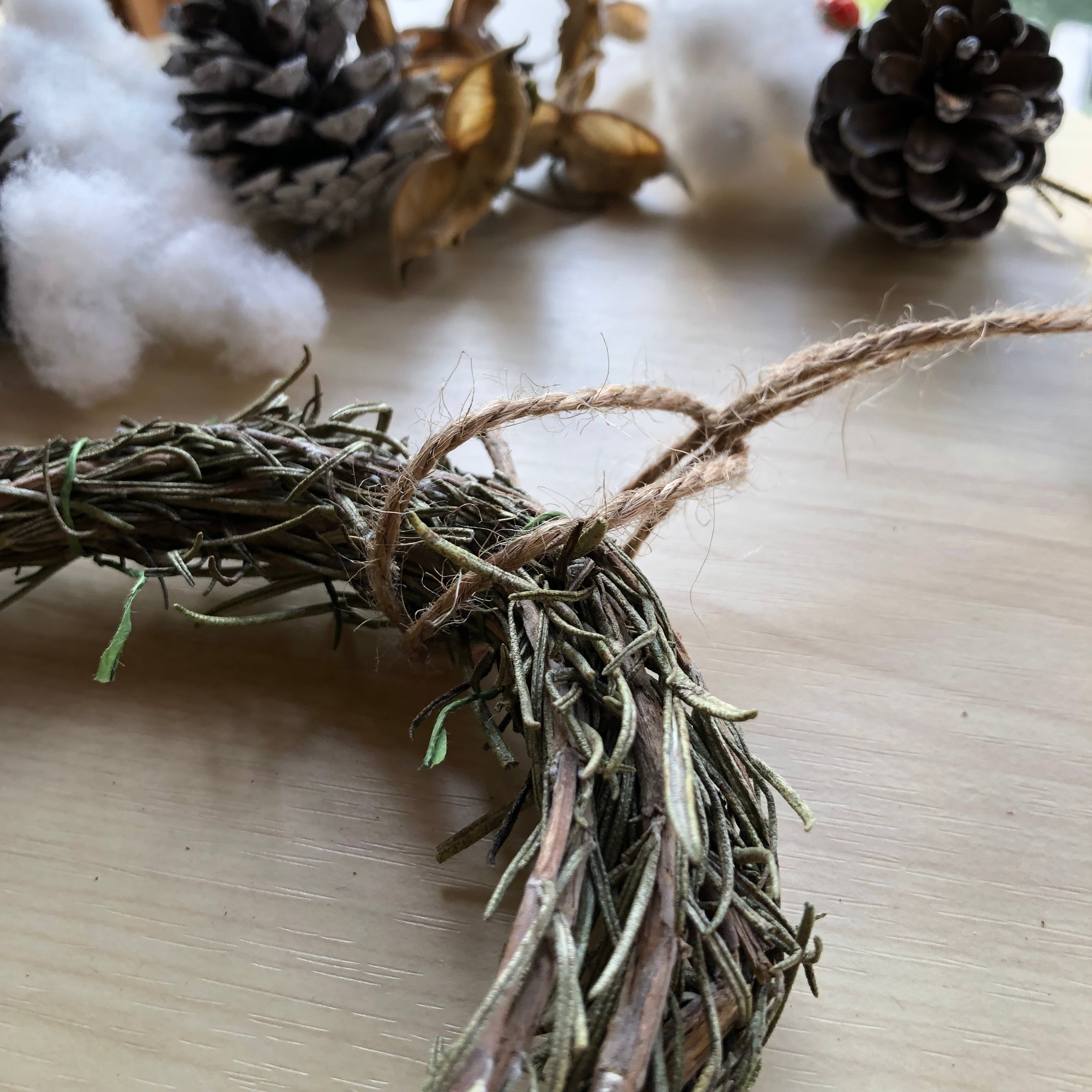 ②松ぼっくりをワイヤーを交差させてリース土台の後ろでワイヤーをねじって留めます。*リース土台はドライなので触りすぎると葉がポロポロ取れてしまいます。